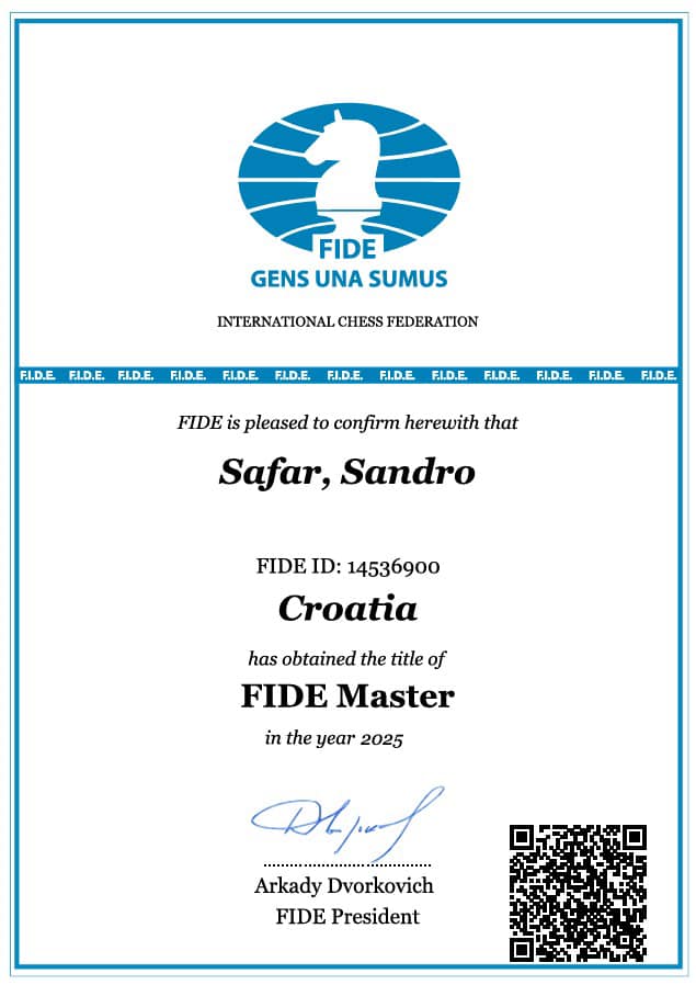 Nakon impresivne prošlogodišnje sezone i velikih uspjeha na Europskom prvenstvu, te 2 Ligi Centar, naš član Sandro Šafar je i službeno osvojio titulu FIDE majstora.