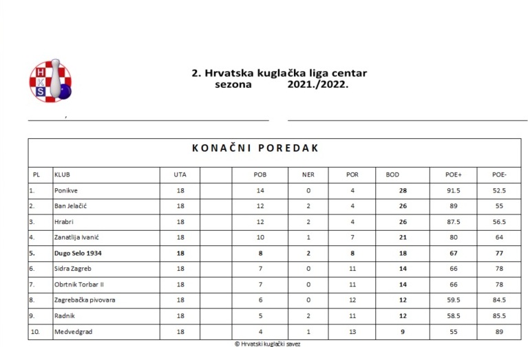Naravno, nepostojanje kuglane u gradu, treniranje i igranje utakmica u 25km udaljenoj V. Gorici učinilo je svoje. Ipak, i u takvim (ne)uvjetima kuglači su uspjeli ostvariti odlične rezultate. Iako je prvotni cilj bio izboriti ostanak u 2. Hrvatskoj ligi regija centar, isti je debelo premašen te je klub na kraju izborio i više nego dobro 5. mjesto. Iako smo veći dio sezone bili lišeni usluga trojice ponajboljih igrača iz prethodnih godina(Z.Šoka, S.Zrile i M. Prsteca) uspijevali smo pobjeđivati, na papiru, puno jače protivnike, te ponijeti epitet najugodnijeg iznenađenja sezone. Najbolji naš igrač bio je Slavko Zrile sa prosjekom od 551,93 čunja, drugi je Ronald Šutić sa 549,33 i treći Ivica Damjanović sa 538,28.